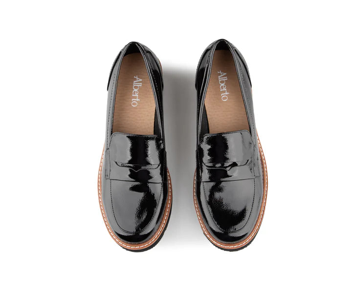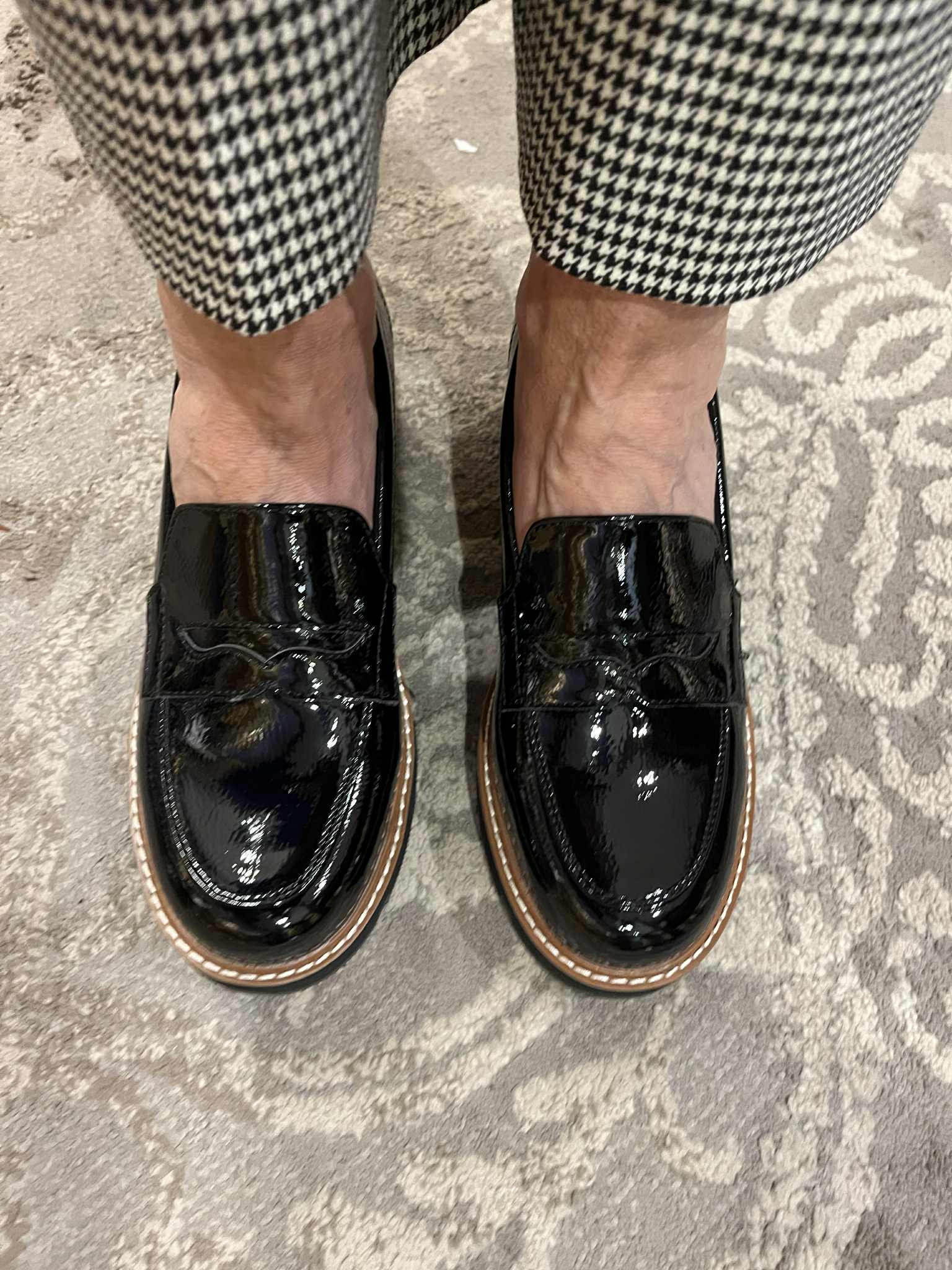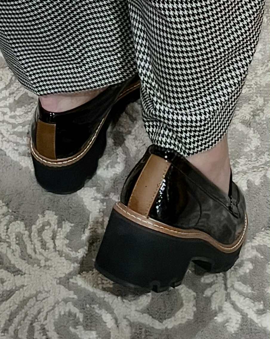 Faux patent black leather platform loafer, with detailed tan piping and top stitching.