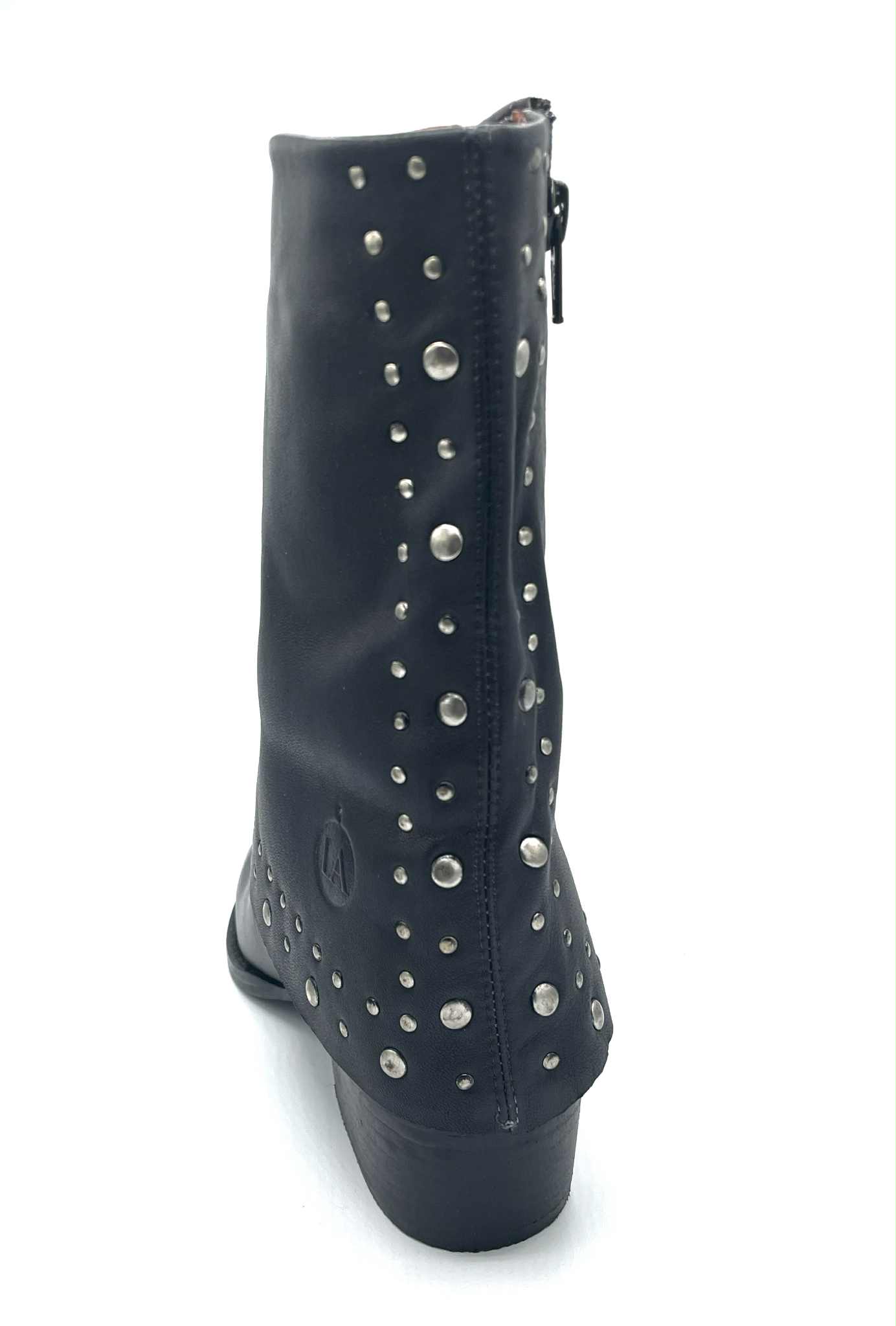 This stunning western meets biker inspired black leather boot is a mid calf almond toe boot with a full overlay of studded leather.