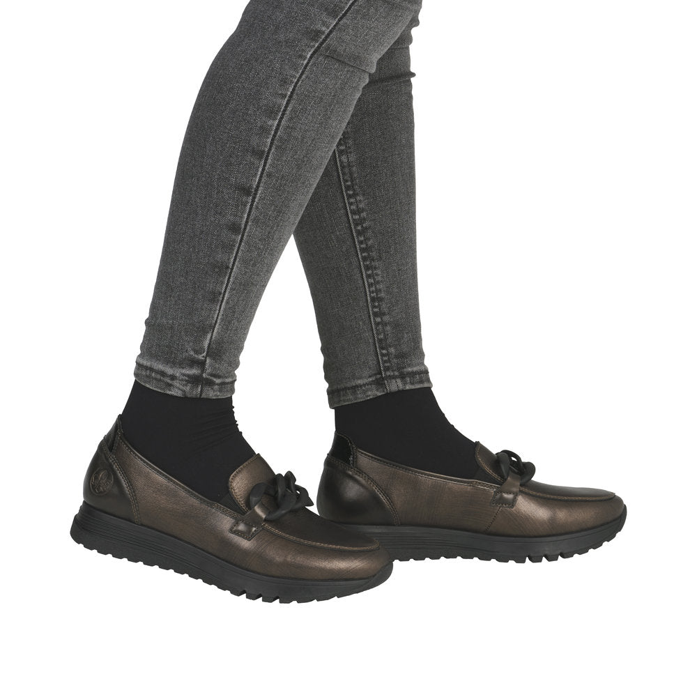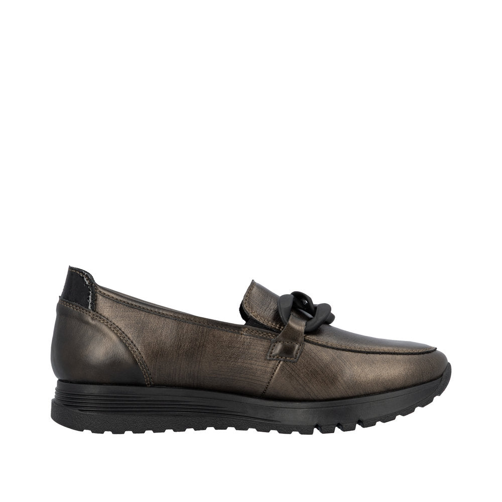 Versatile and neutral bronze leather loafer with oversized matte black chain detail.