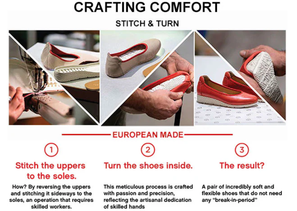 Handmade in Portugal using a Stitch and Turn Handcrafted technique resulting in an incredibly soft and flexible shoe that does not require a "breaking in period". How? By reversing the uppers and stitching it sideways to the sole.